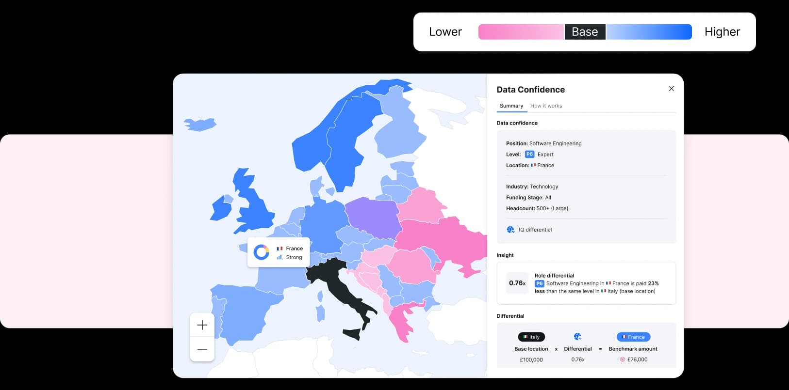Capture local market nuance relative to your HQ with map visualisations. Help your employees understand and rationalise global pay differences with ease.